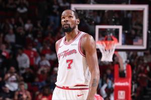 前三節(jié)結(jié)束時(shí),火箭還以96-73領(lǐng)先76人23分。當(dāng)時(shí)杜蘭特被換下場(chǎng)休息,有望三節(jié)打卡。結(jié)果末節(jié)火箭場(chǎng)上球員表現(xiàn)太抽象,被76人轟出一波進(jìn)攻高潮追到11分,直接把杜蘭特打了回來。76人攻擊波還在繼續(xù),把分差縮小到7分,杜蘭特命中三分+助攻阿隆·霍勒迪投進(jìn)三分,為火箭穩(wěn)住局面。
