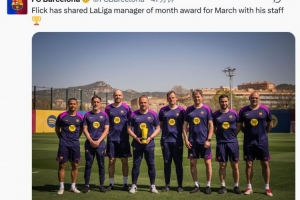 巴塞羅那在3月3場(chǎng)西甲保持全勝,主教練弗里克獲得了西甲聯(lián)賽頒發(fā)的三月最佳教練獎(jiǎng)。弗里克一向重視教練團(tuán)隊(duì)的工作,他因此要求與自己最信任的團(tuán)隊(duì)成員一起領(lǐng)取這份榮譽(yù)。