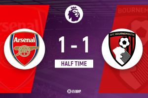 上半場補時2分鐘。半場戰(zhàn)罷,阿森納1-1伯恩茅斯。