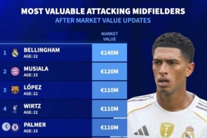 德轉(zhuǎn)列前腰身價(jià)榜:貝林厄姆壓穆西亞拉居首,費(fèi)爾明、維爾茨在列