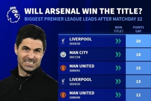 英超歷史32輪后至少領(lǐng)先8分球隊(duì),此前全部最終奪冠: