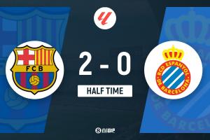 上半場(chǎng)補(bǔ)時(shí)3分鐘,巴薩2-0西班牙人。
