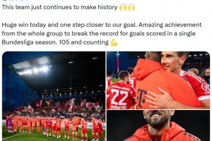 他也在賽后通過社媒曬出比賽照,并慶祝勝利:“這支球隊(duì)仍在創(chuàng)造歷史????今天取得重大勝利,離我們的目標(biāo)又近了一步。全隊(duì)共同努力取得非凡成就,打破了德甲單賽季進(jìn)球紀(jì)錄。目前已經(jīng)105球了,而且還在繼續(xù)增加!”