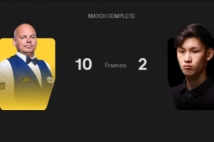 本場比賽,賓漢姆一上來送出9連鞭,以9-0領(lǐng)先王信伯,隨后王信伯連追2局,最終2-10不敵賓漢姆。