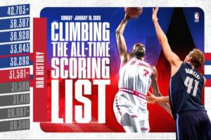 體育資訊01月19日訊 火箭今日主場119-110輕取鵜鶘。賽前,杜蘭特距離NBA歷史得分榜第六的諾維茨基僅差16分。