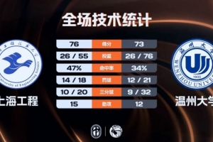 末節(jié)比賽,上海工程在前三分鐘沒(méi)有得分,溫州大學(xué)先拿6分穩(wěn)住局勢(shì),但之后的比賽他們突然斷電,上海工程打了一波11-0的攻勢(shì)直接完成反超,孫發(fā)航兩罰全中,盛家銘絕平三分不中,最終上海工程76-73險(xiǎn)勝溫州大學(xué)。