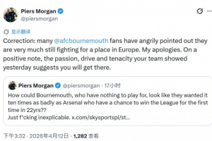 英國(guó)名嘴、阿森納球迷摩根在社媒痛批槍手的表現(xiàn),他表示無欲無求的伯恩茅斯比爭(zhēng)冠的阿森納展現(xiàn)出了更強(qiáng)烈的求勝欲望。