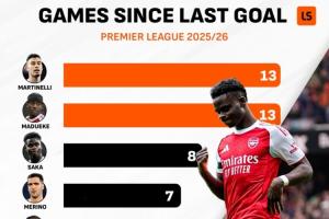 體育資訊01月19日訊 盡管阿森納目前在英超以7分優(yōu)勢領(lǐng)跑,但根據(jù)LiveScore統(tǒng)計,阿森納隊內(nèi)一眾攻擊手已經(jīng)遭遇至少3輪的聯(lián)賽球荒,多的甚至有13輪。