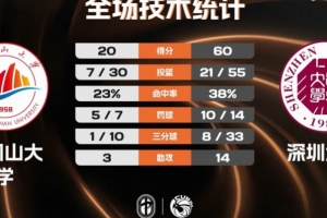 末節(jié)決戰(zhàn),井岡山大學(xué)依然半節(jié)多時(shí)間內(nèi)一分未得,李魯粵連續(xù)籃下取分幫助深圳大學(xué)領(lǐng)先到40分以上。楊涵銀造殺傷終于止血,但孫琦越三分再命中回應(yīng),時(shí)間所剩無幾,最終深圳大學(xué)60-20大勝井岡山大學(xué)。