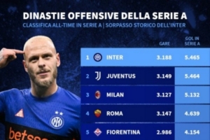 意甲歷史進(jìn)球榜:國米&尤文遙遙領(lǐng)先,米蘭、羅馬、佛羅倫薩前五