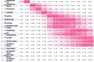 本輪開始前,opta預(yù)測阿森納有97.6%概率奪冠,阿森納1-2不敵伯恩茅斯后,opta預(yù)測阿森納奪冠概率為93.5%。