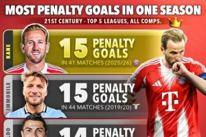 本世紀(jì)單賽季點球進球榜:凱恩41場15球居首,C羅、梅西14球次之