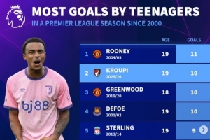 新世紀(jì)英超單賽季U20進(jìn)球榜: