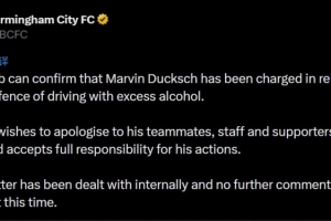 伯明翰官方:前鋒杜克施因涉嫌酒駕被起訴,將對(duì)行為承擔(dān)全部責(zé)任