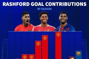 體育資訊4月15日訊 巴薩將在本輪歐冠再戰(zhàn)馬競,拉什福德的表現(xiàn)將至關(guān)重要,《轉(zhuǎn)會市場》統(tǒng)計顯示拉什福德本賽季直接參與進球數(shù)已可排在生涯第4位。