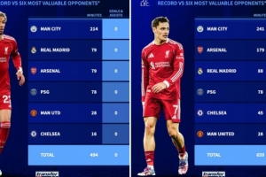 德轉(zhuǎn)數(shù)據(jù)統(tǒng)計顯示,本賽季代表利物浦出戰(zhàn)身價最高的6個對手(曼城、皇馬、巴黎、阿森納、曼聯(lián)、切爾西),維爾茨(共計659分鐘)和?;倏耍ü灿?94分鐘)僅收獲0球0助攻: