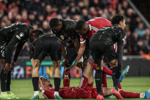 體育資訊4月15日訊 歐冠1/4決賽次回合利物浦主場(chǎng)迎戰(zhàn)巴黎,?;倏松习雸?chǎng)無(wú)對(duì)抗倒地,疑似遭遇跟腱重傷。