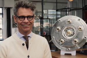 1949年,冠軍獎(jiǎng)盤取代了在二戰(zhàn)中遺失的“維多利亞”雕像。這座獎(jiǎng)杯由科隆工藝學(xué)校的藝術(shù)教授伊麗莎白·特雷斯科設(shè)計(jì)并制作。自1903年以來,所有德國(guó)冠軍的名字都被鐫刻在這座獎(jiǎng)盤上,每賽季結(jié)束時(shí),新的冠軍名字都會(huì)被添加上去。