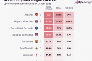 OPTA對拜仁、阿森納等隊(duì)的晉級概率進(jìn)行了預(yù)測,拜仁晉級概率83.4%,阿森納晉級概率88%,也就是說皇馬的晉級概率僅為16.6%,葡萄牙體育則低至12%。