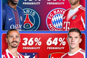 Score 90對(duì)4隊(duì)晉級(jí)決賽的概率進(jìn)行了預(yù)測(cè),拜仁55%,巴黎圣日耳曼45%,阿森納64%,馬競(jìng)36%。