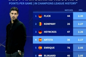 體育資訊4月16日訊 在歐冠淘汰賽次回合,阿森納0-0戰(zhàn)平葡體,總比分1-0晉級(jí)。以下為歐冠歷史主帥場(chǎng)均積分榜(至少執(zhí)教25場(chǎng)):