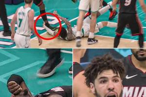 在昨日黃蜂戰(zhàn)勝熱火的附加賽上半場(chǎng),拉梅洛·鮑爾倒地后手臂掃到了阿德巴約的腳踝,導(dǎo)致后者受傷退賽。
