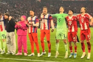 卡爾因傷缺席此役,賽后他與拜仁隊(duì)友一起慶祝晉級(jí),這位小將穿著一身粉色衣服,在球員之中格外顯眼,他的帽子還被比朔夫搶走。