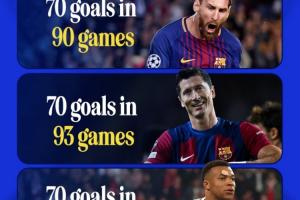 CBS體育曬圖,統(tǒng)計球員打進歐冠70球時所用的場次。其中梅西90場70球歷史最快,萊萬93場70球第二,姆巴佩98場70球第三。