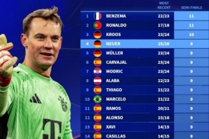 諾伊爾第9次參加歐冠半決賽,并列第4!僅次本澤馬、C羅、克羅斯