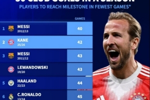 單賽季達(dá)成50球最快紀(jì)錄榜:梅西40場(chǎng)居首,凱恩本賽季42場(chǎng)次席