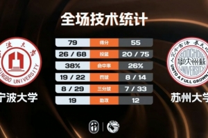 體育資訊4月16日訊 CUBAL一級聯(lián)賽東南賽區(qū)男子組1/8決賽,寧波大學(xué)今日對陣蘇州大學(xué)。