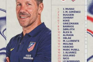 1-穆索、2-吉梅內(nèi)斯、3-魯杰里、5-喬尼、6-科克、7-格列茲曼、8-巴里奧斯、9-瑟爾洛特、10-巴埃納、11-阿爾馬達(dá)、13-奧布拉克、14-馬科斯·略倫特、16-莫利納、17-漢茨科、18-普比爾、19-阿爾瓦雷斯、20-朱利亞諾·西蒙尼、23-尼科、24-勒諾爾芒、28-陶菲克·塞義杜、29-拉亞內(nèi)·貝萊德、31-埃斯奎維爾、34-胡里奧·迪亞斯、37-伊克爾·盧克