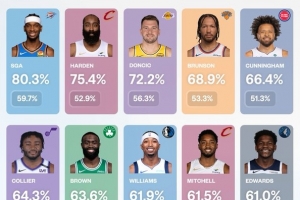 注:要求球員至少出戰(zhàn)40場,上場時間至少20分鐘