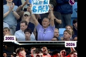 英超官方社媒曬出考文垂2001年、2026年的對(duì)比照片,對(duì)考文垂表示祝賀。2001年的照片中,考文垂球迷舉起的標(biāo)語(yǔ)寫著:“我們會(huì)回來(lái)的!”