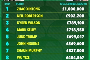 2025/26賽季斯諾克獎(jiǎng)金收入排行榜:趙心童100萬英鎊位列第一