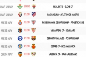 體育資訊4月21日訊 西甲官方公布了第36輪賽程安排,馬競、巴薩和皇馬將分別在北京時間5月13日、14日和15日凌晨出戰(zhàn)。
