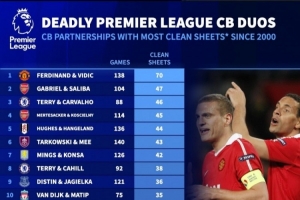 2000年以來(lái)中衛(wèi)組合英超零封榜(僅統(tǒng)計(jì)兩人聯(lián)袂首發(fā)比賽)